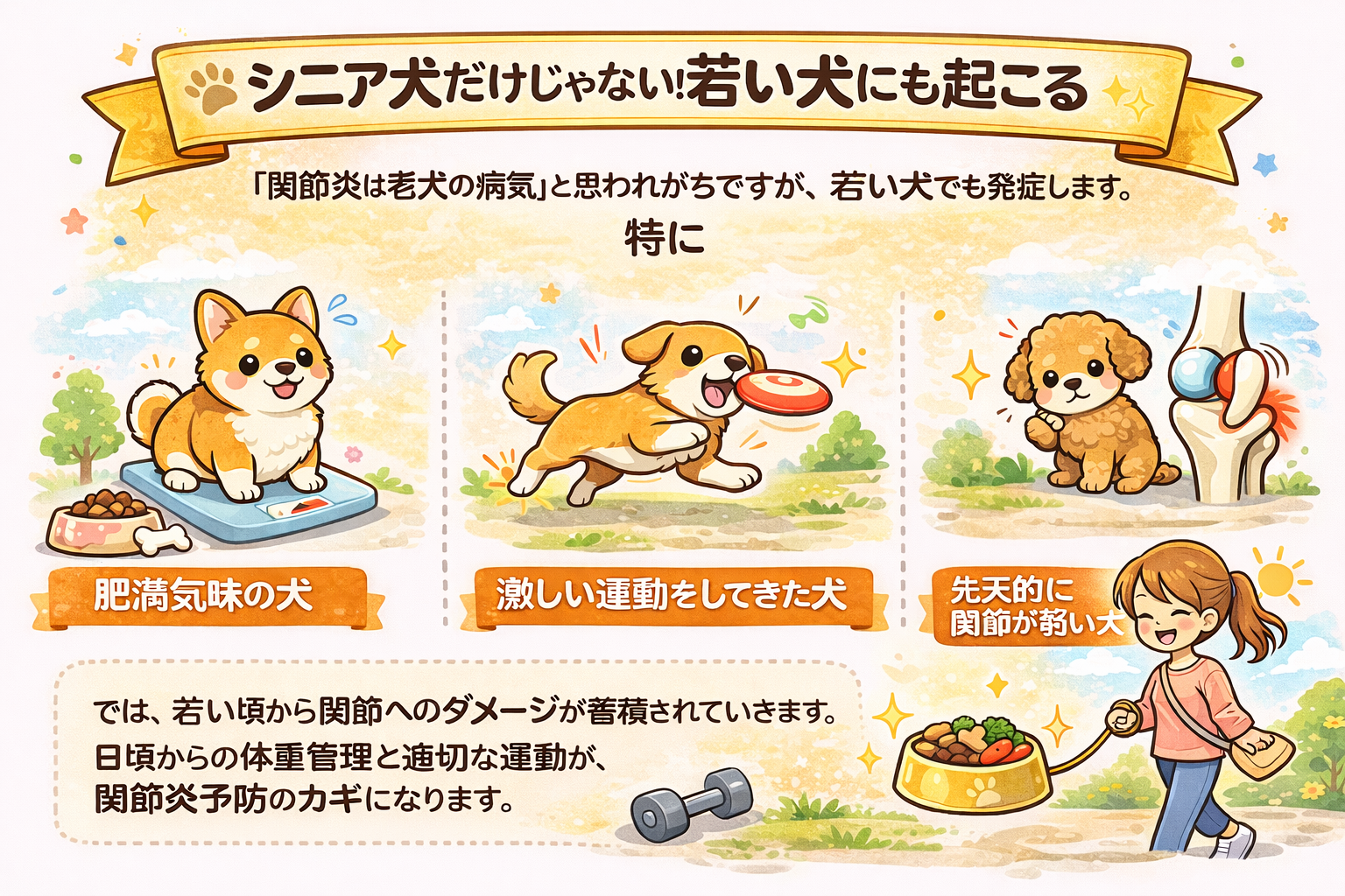 「関節炎は老犬の病気」と思われがちですが、若い犬でも発症します。